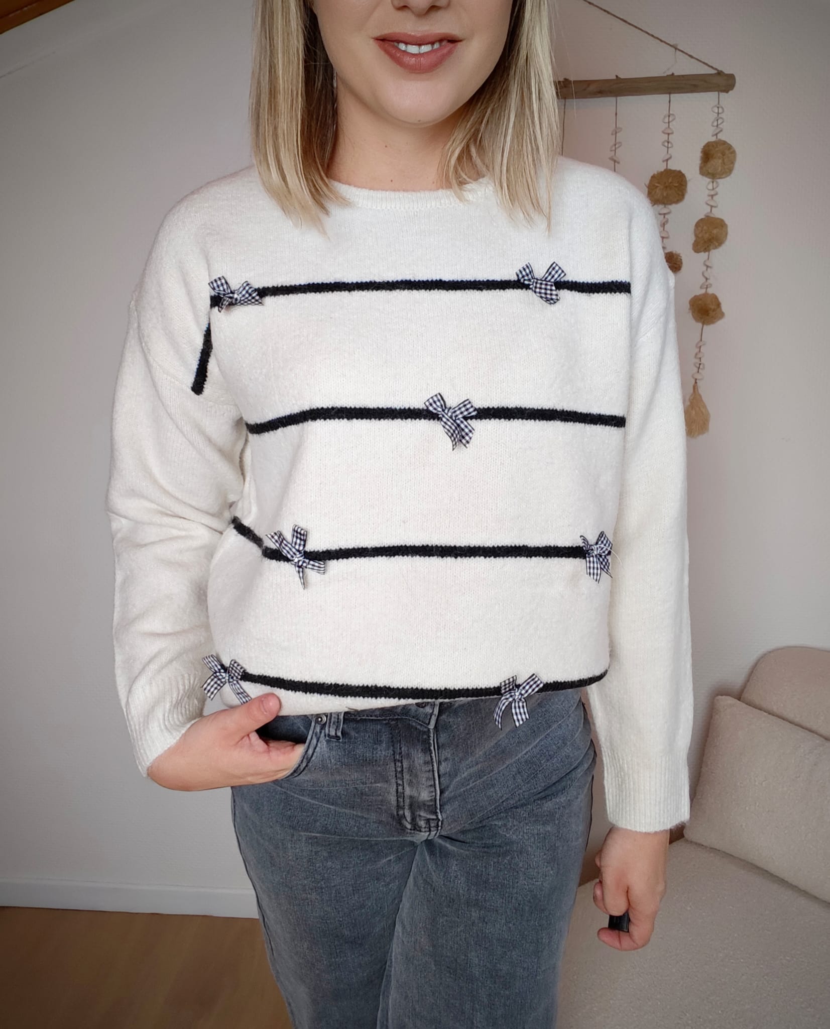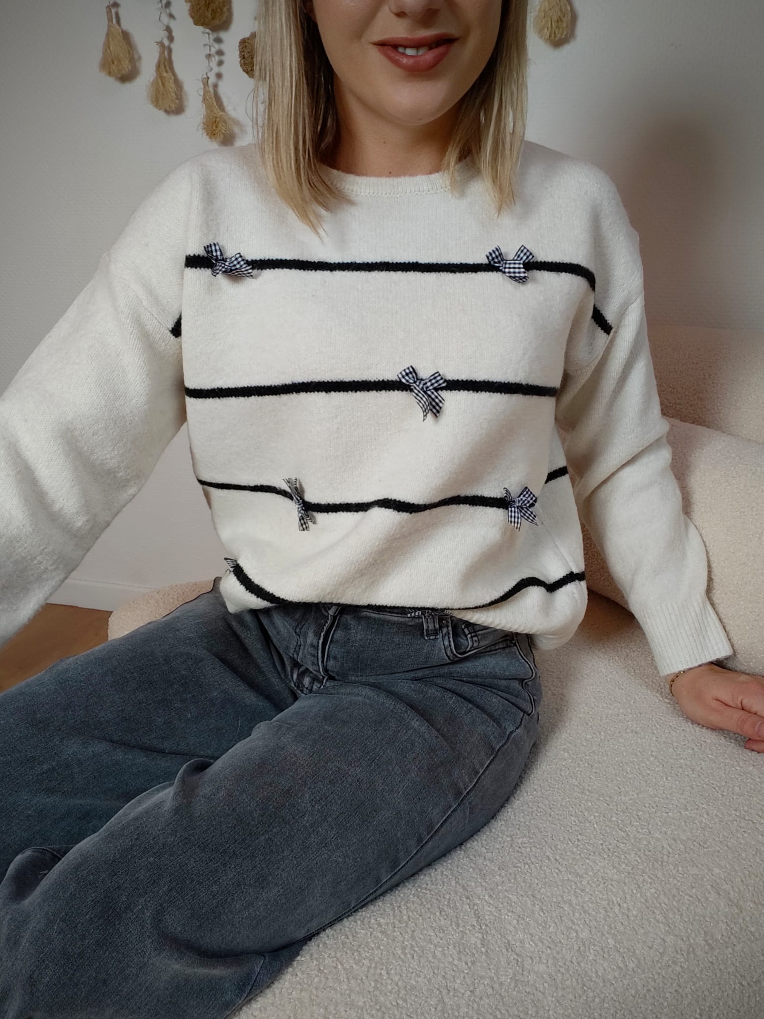 Le pull Colette incarne l’élégance décontractée avec une touche féminine subtile. Sa maille douce écrue est rehaussée de fines rayures noires et de petits nœuds délicats qui apportent du charme et du caractère à la pièce.