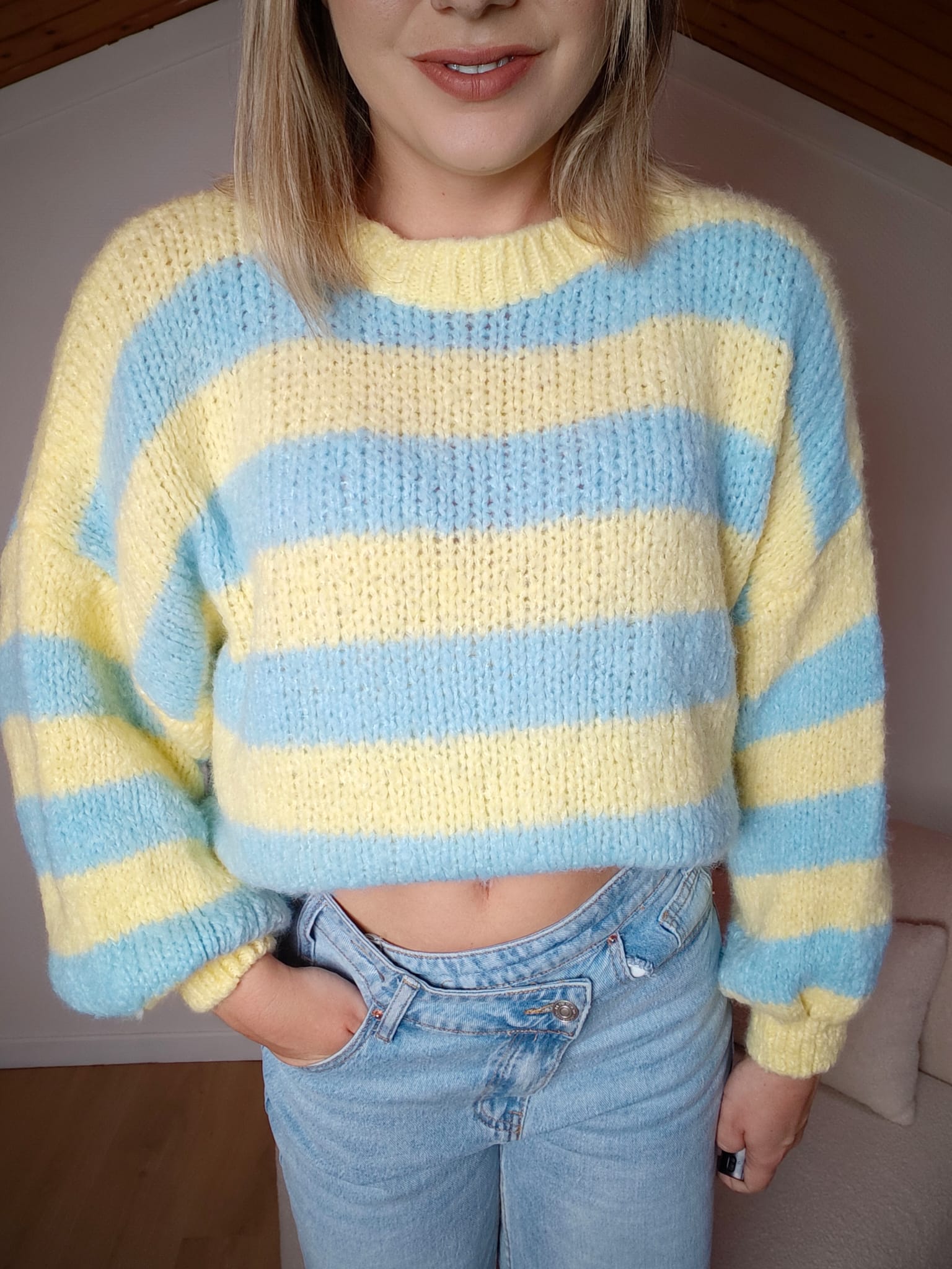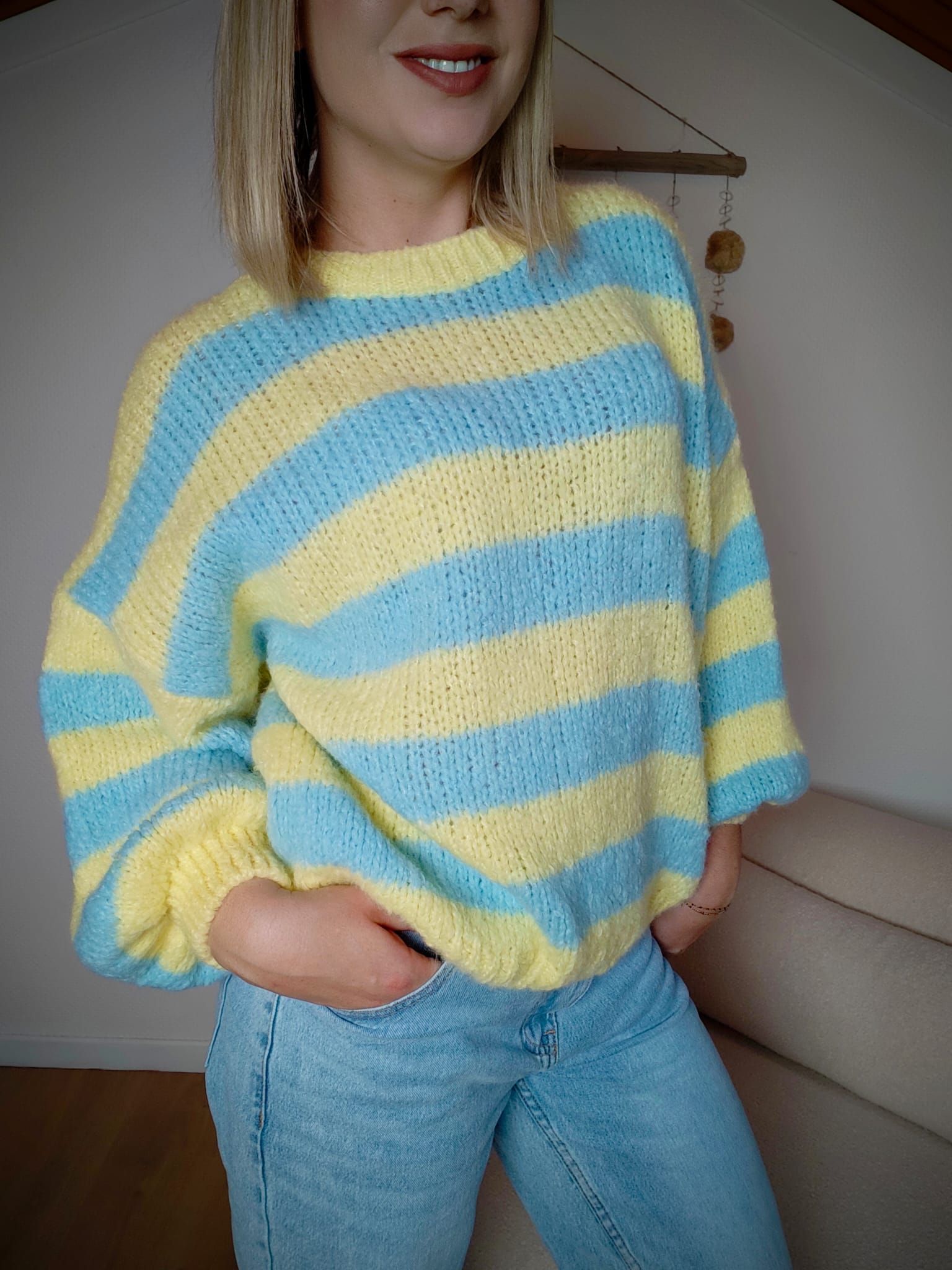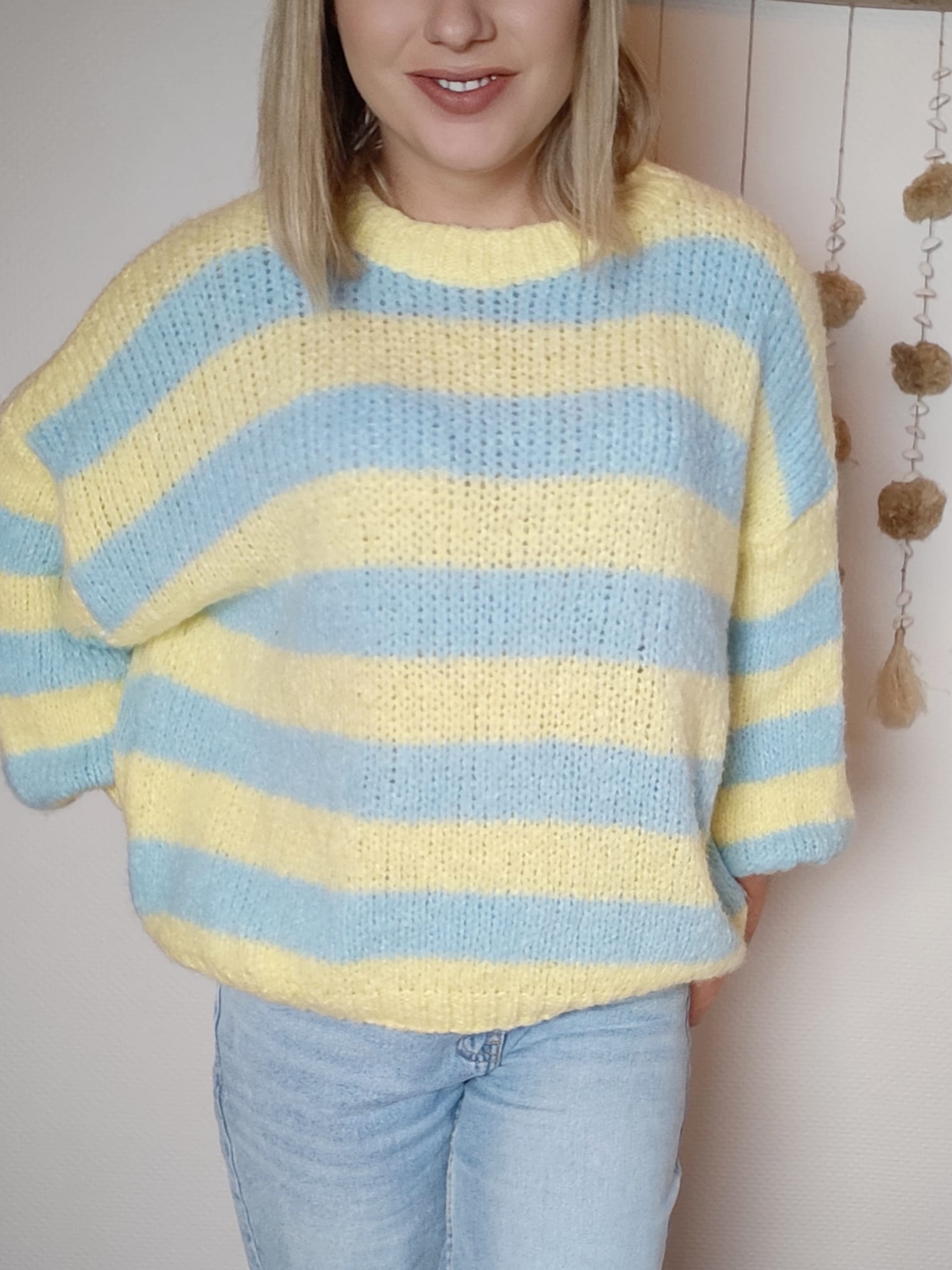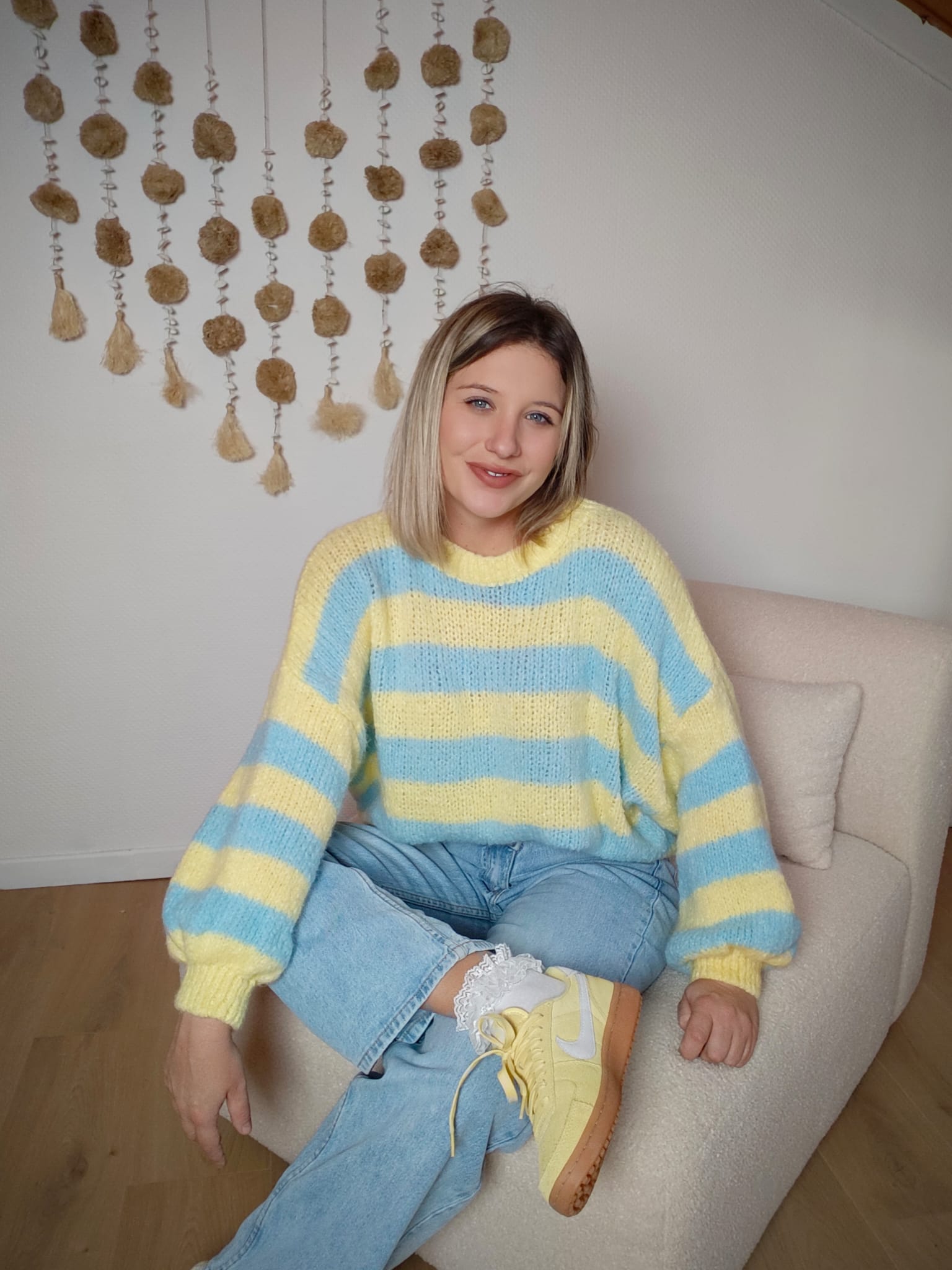 Le pull illumine la silhouette avec ses rayures jaunes et bleues pleines de fraîcheur. Sa maille douce et moelleuse apporte un confort absolu tout en donnant une touche lumineuse à la tenue.