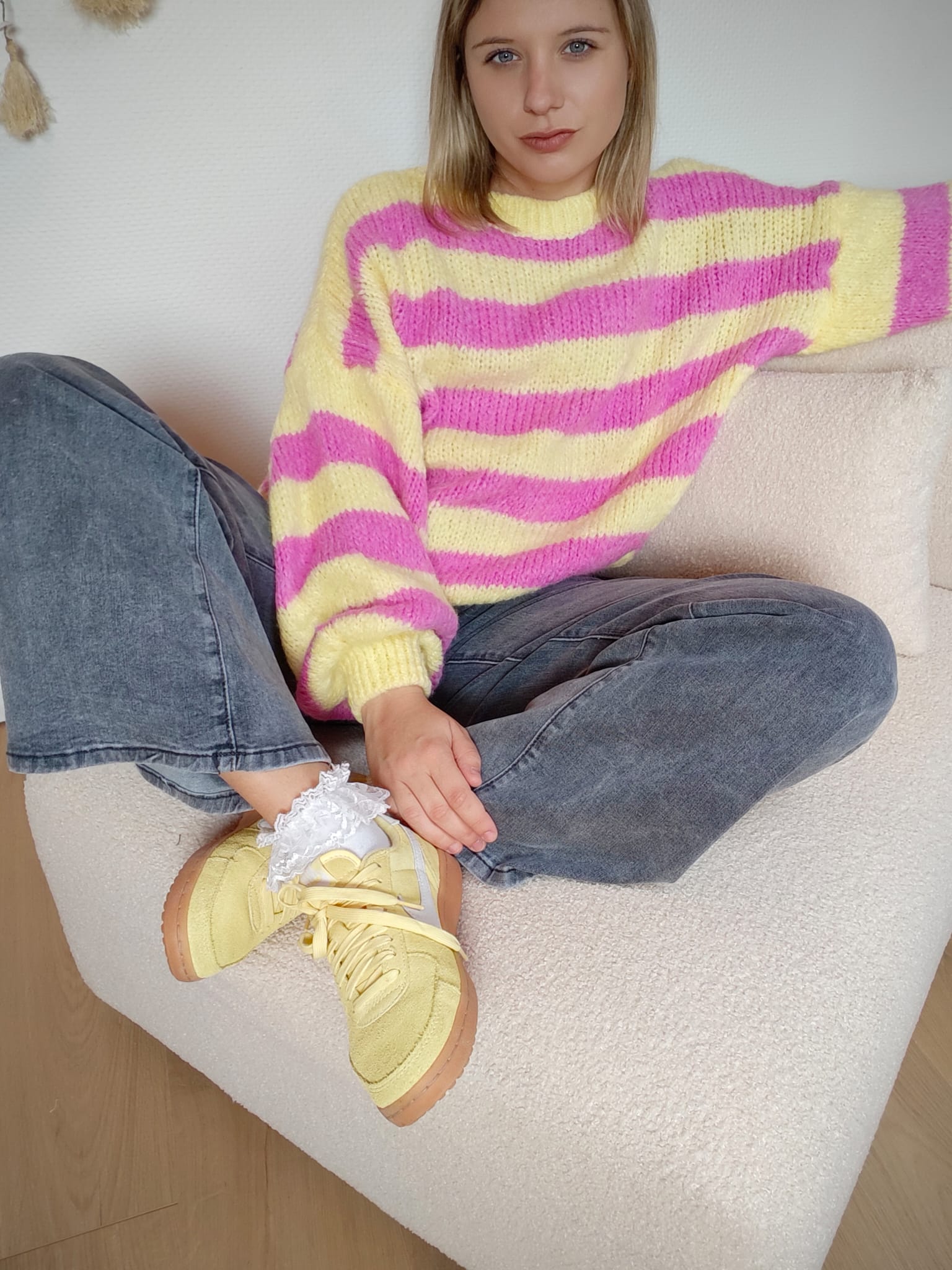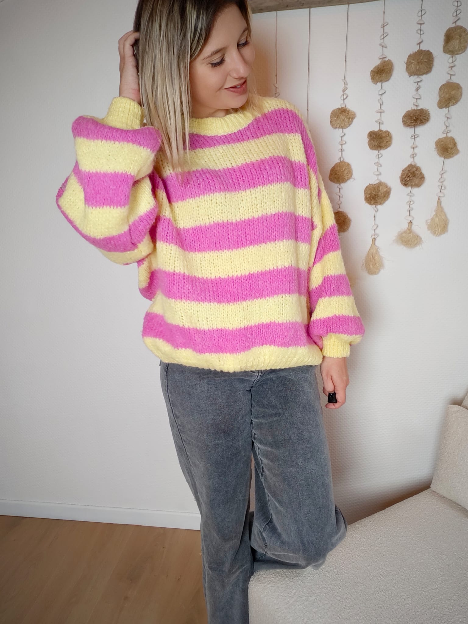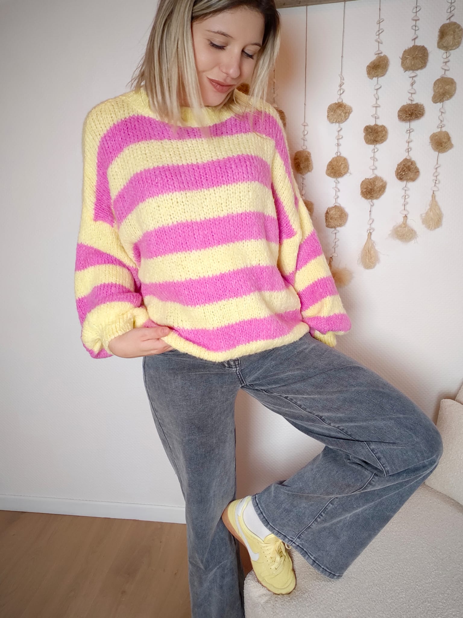 Avec ses rayures roses et jaunes ultra pop, le pull Lola apporte instantanément de la couleur à ton look. Sa maille douce et moelleuse, sa coupe légèrement oversize et ses manches volumineuses en font une pièce aussi confortable que stylée.
