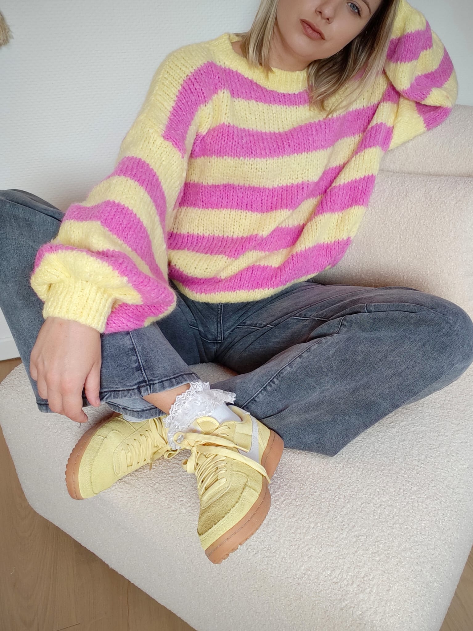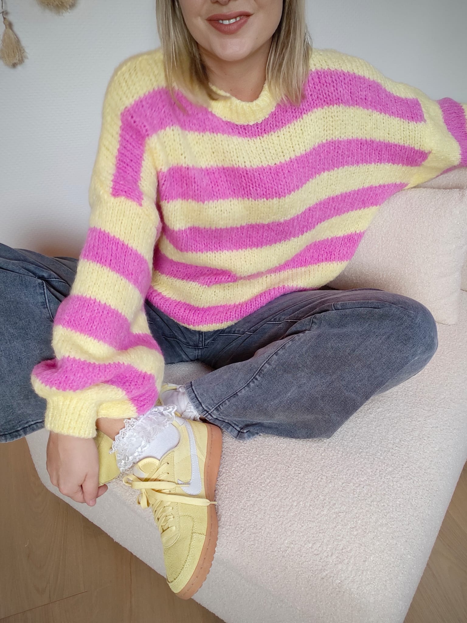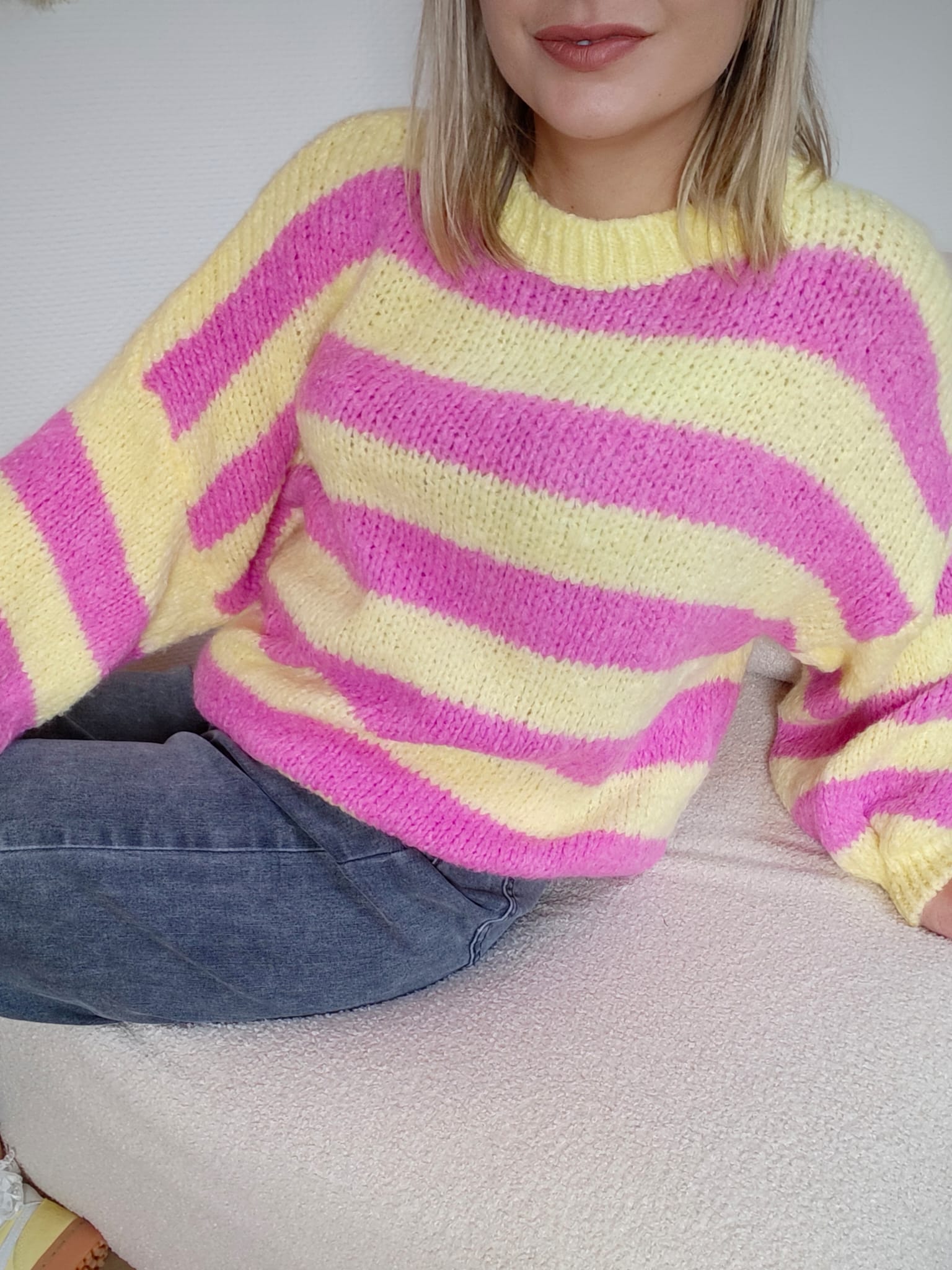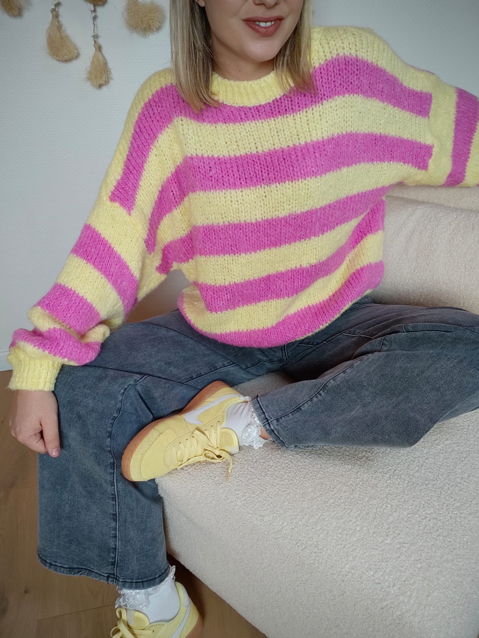 Avec ses rayures roses et jaunes ultra pop, le pull Lola apporte instantanément de la couleur à ton look. Sa maille douce et moelleuse, sa coupe légèrement oversize et ses manches volumineuses en font une pièce aussi confortable que stylée.