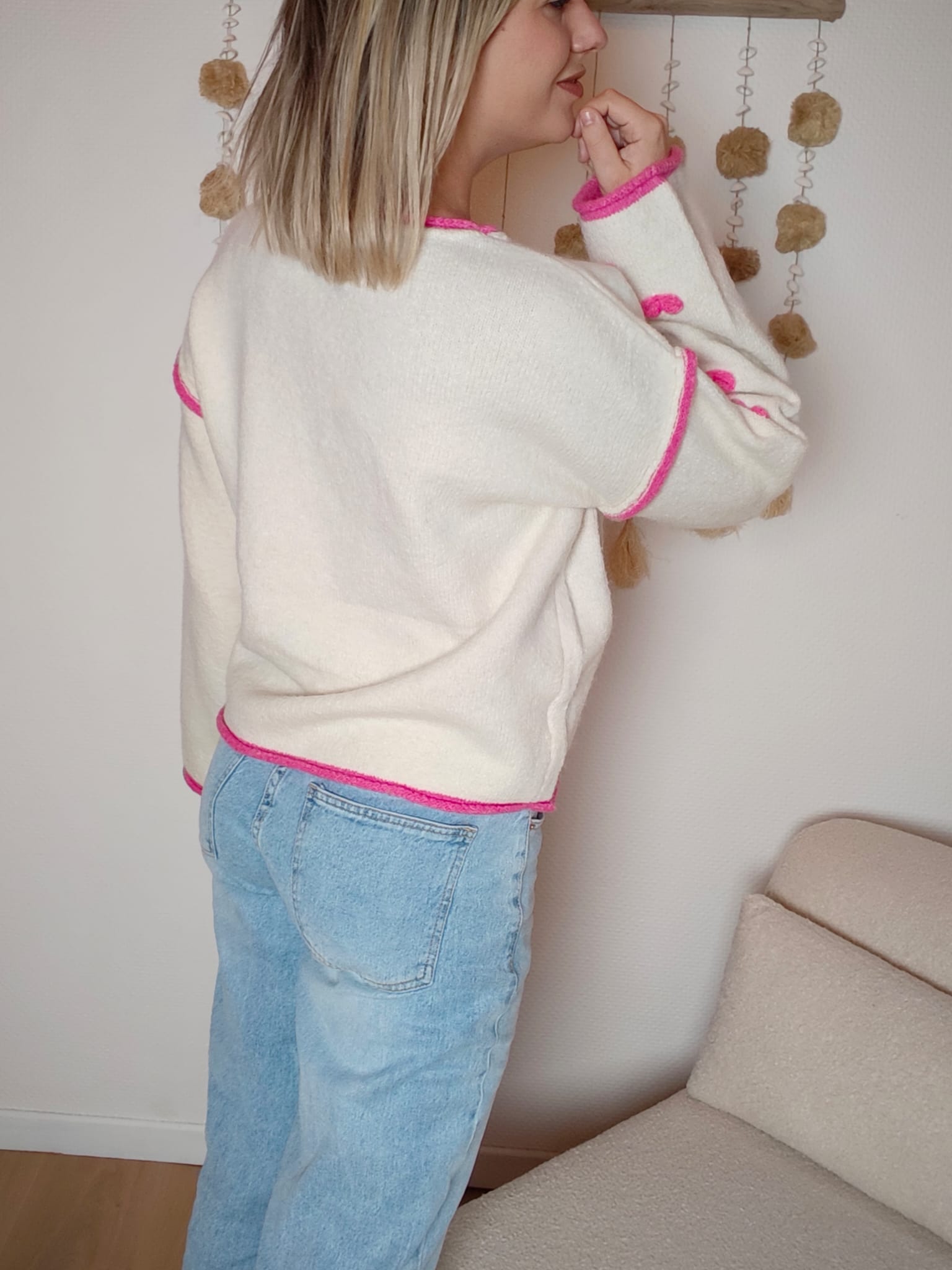 Le pull Mila est la pièce parfaite pour ajouter une touche tendre et lumineuse à votre dressing. Sa maille douce écrue est sublimée par de petits cœurs roses en relief et des finitions contrastées qui lui donnent un charme unique.