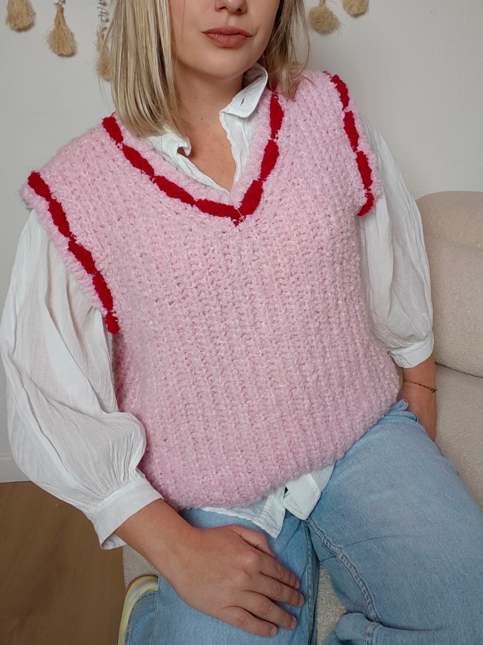 Le pull sans manche Romane apporte une touche rétro pleine de charme à une tenue. Sa maille moelleuse rose poudré contrastée par ses finitions rouges crée un look à la fois doux et affirmé. Parfait en superposition sur une chemise ou une blouse, il donne immédiatement du style sans effort.