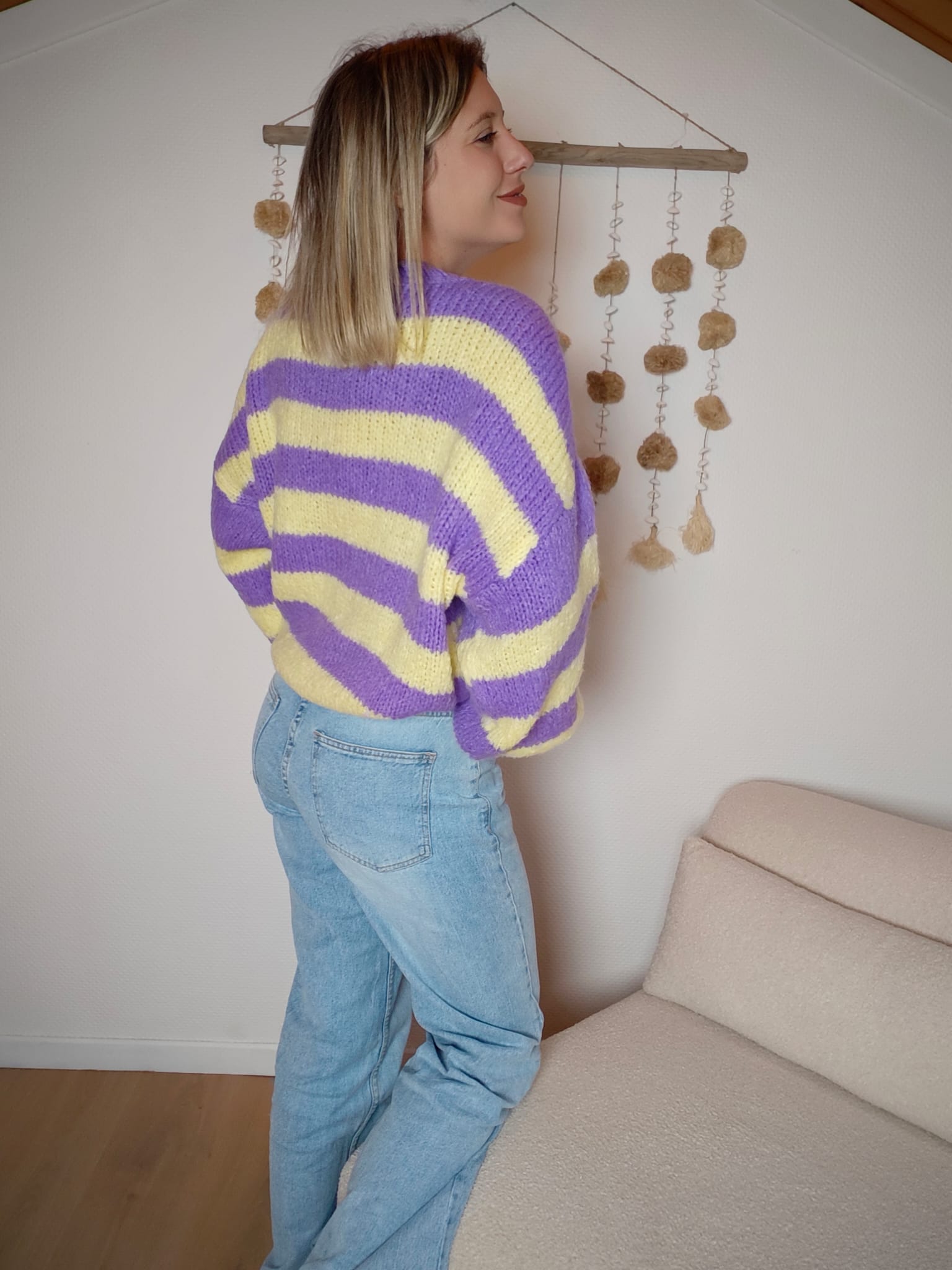 Craquez pour le pull Ava, une pièce ultra cosy aux rayures pastel qui illumine instantanément une tenue. Son mélange de violet et de jaune apporte une touche fraîche et lumineuse, parfaite pour la mi-saison comme pour l’hiver.