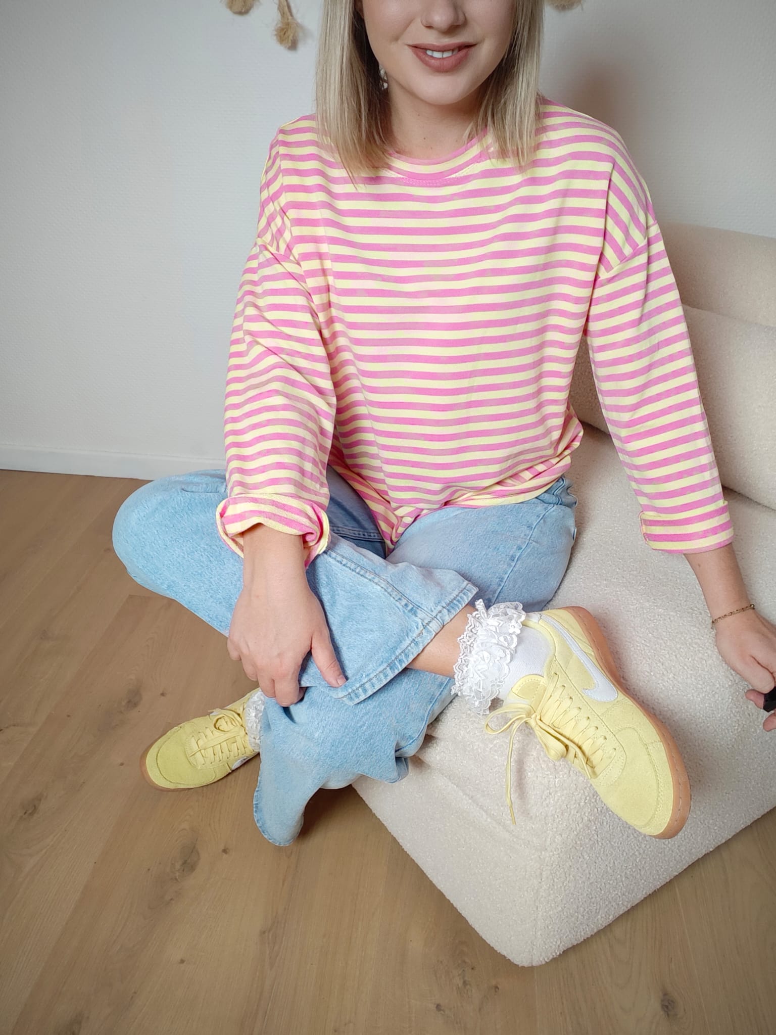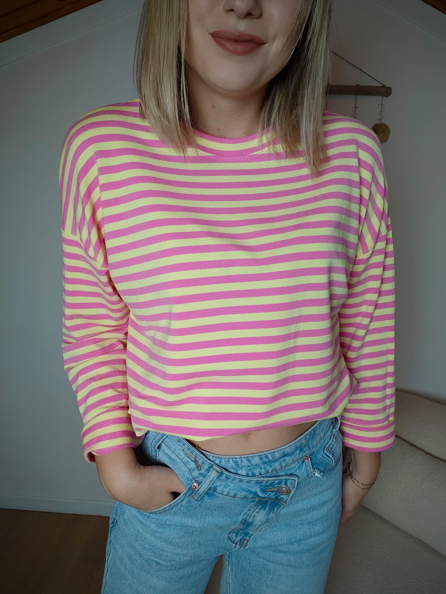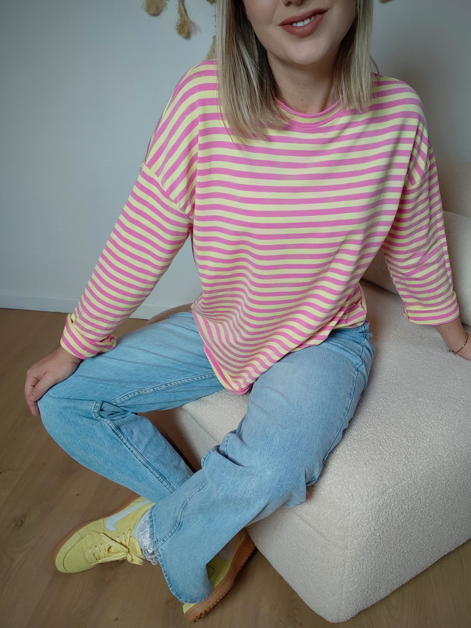 Le sweat Candy est une vraie dose de bonne humeur à lui tout seul. Ses rayures roses et jaunes apportent une touche pop et lumineuse qui dynamise instantanément une tenue. Sa coupe ample et fluide offre un confort absolu tout en gardant un style casual tendance.