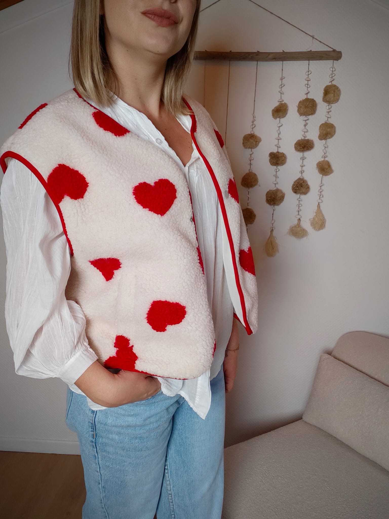 La veste sans manche Élisa est la pièce cocooning qui apporte une touche romantique immédiate à une tenue. Son fond écru tout doux contrasté par ses cœurs rouges crée un look tendre et affirmé à la fois. Sa matière effet teddy enveloppe la silhouette de chaleur tout en restant légère.